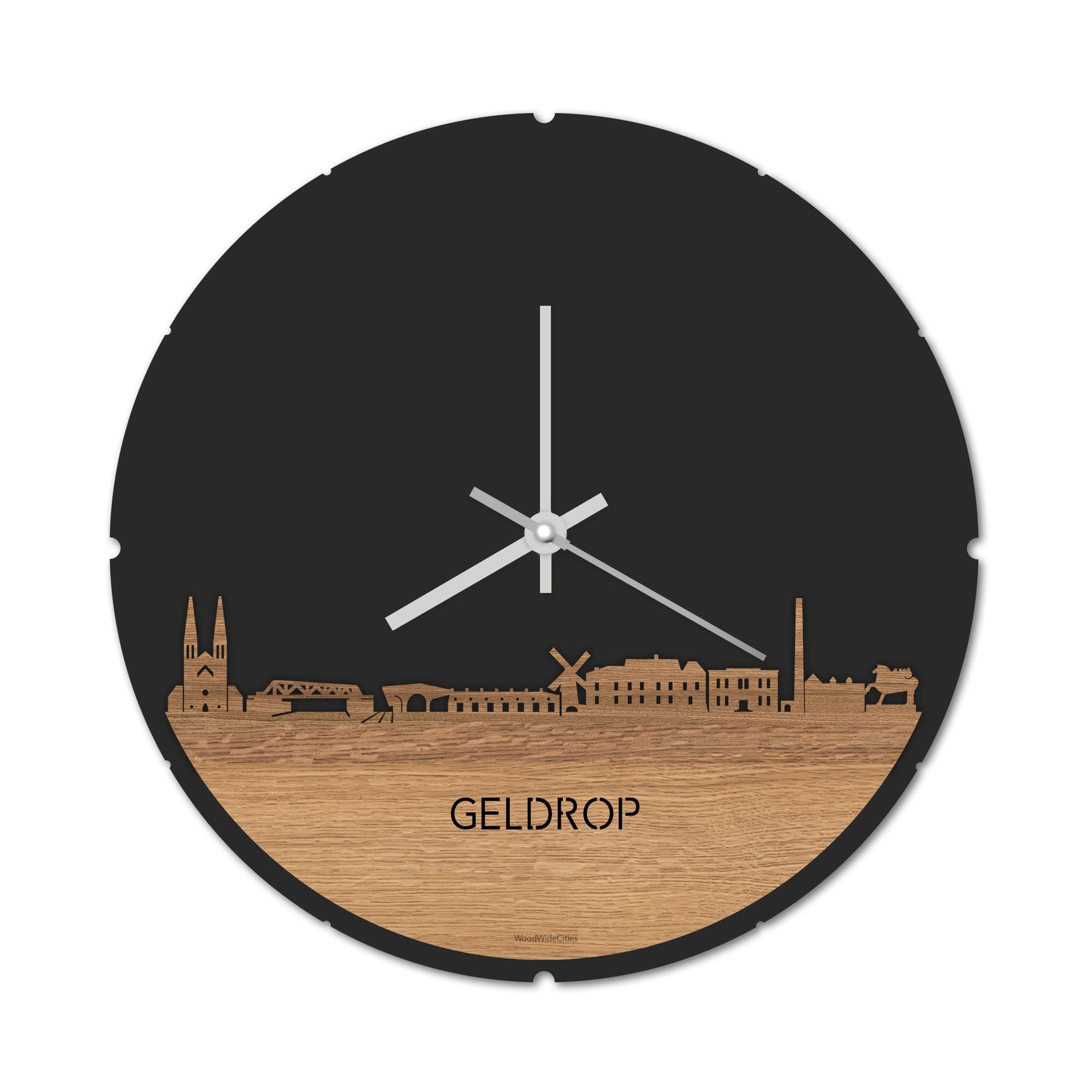 Blijf bij de tijd met de ronde skyline wandklok Dat geldt dubbelop als je deze multifunctionele houten Skyline Klok Rond Geldrop Eiken in huis haalt. Deze klok met de skyline van Geldrop houdt je bij de tijd, maar neemt je ook mee terug naar de stad waar je bent geboren of waar je hebt gestudeerd. Een mooie herinnering, elke keer als je kijkt hoe laat het is! Of wat dacht je van een afscheidscadeau, een tijdloos geschenk voor moeder- of vaderdag en andere mijlpalen zoals trouwerijen, het behalen van diploma’s en het openen van een nieuw kantoor of bedrijf, een spetterende binnenkomer voor je kind die gaat studeren in een andere stad of een ideaal cadeau voor de housewarming van kennissen en vrienden.