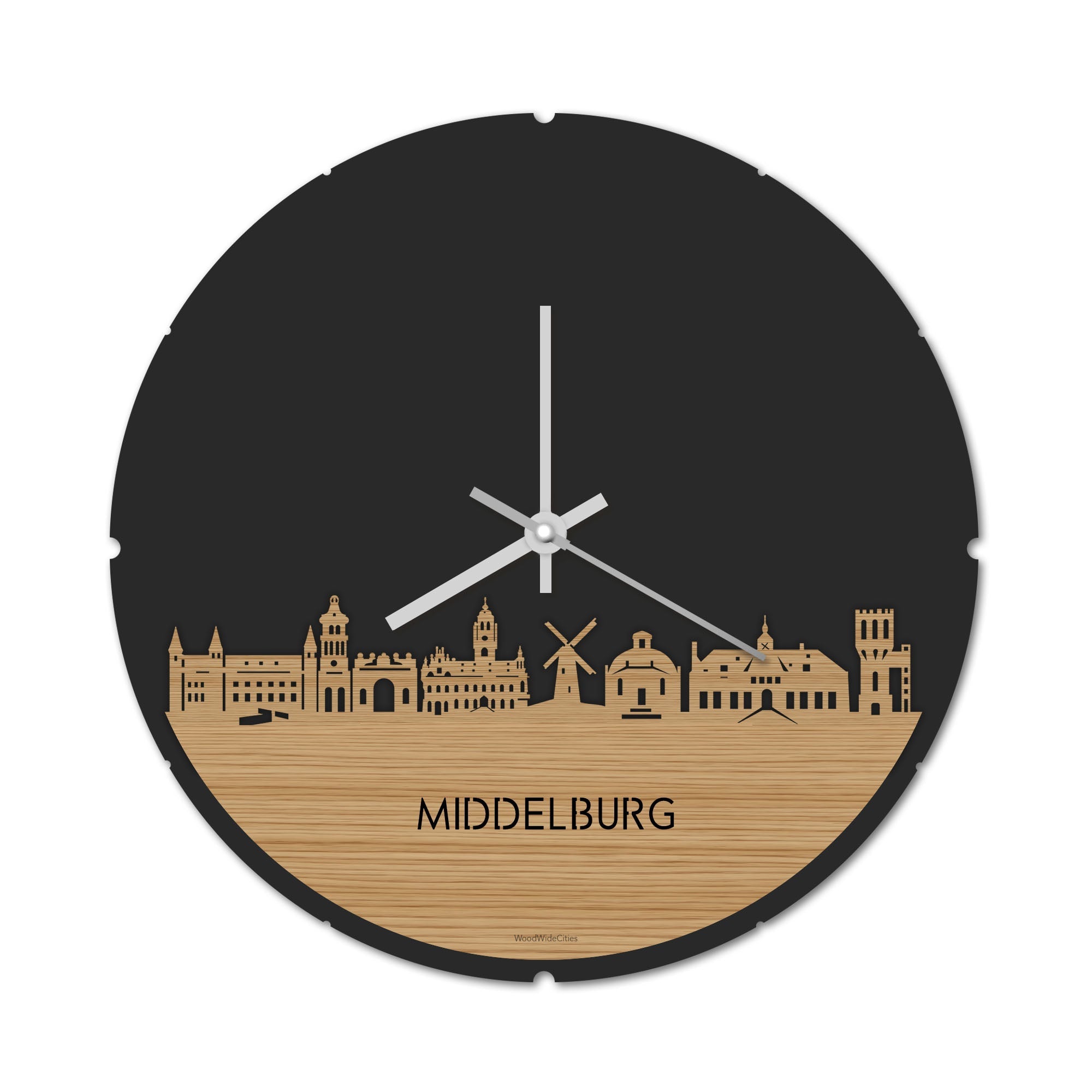 Blijf bij de tijd met de ronde skyline wandklok Dat geldt dubbelop als je deze multifunctionele houten wandklok van WoodWideCities in huis haalt. Deze klok met afbeelding van de skyline van Middelburg houdt je bij de tijd, maar neemt je ook mee terug naar de stad waar je bent geboren of waar je hebt gestudeerd. Een mooie herinnering, elke keer als je kijkt hoe laat het is! Of wat dacht je van een afscheidscadeau, een tijdloos geschenk voor moeder- of vaderdag en andere mijlpalen zoals trouwerijen, het behalen van diploma’s en het openen van een nieuw kantoor of bedrijf, een spetterende binnenkomer voor je kind die gaat studeren in een andere stad of een ideaal cadeau voor de housewarming van kennissen en vrienden.