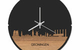 Blijf bij de tijd met de ronde skyline wandklok Dat geldt dubbelop als je deze multifunctionele houten wandklok van Oud Groningen Eiken in huis haalt. Deze klok met de skyline van Groningen houdt je bij de tijd, maar neemt je ook mee terug naar die mooie tijd, naar de stad waar je bent geboren, hebt gewerkt of waar je hebt gestudeerd. Een mooie herinnering, elke keer als je kijkt hoe laat het is!
