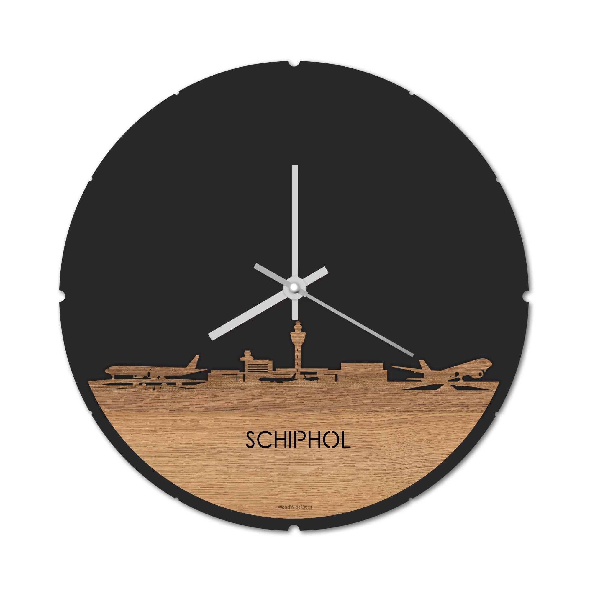 Blijf bij de tijd met de ronde skyline wandklok Dat geldt dubbelop als je deze multifunctionele houten Skyline Klok Rond Schiphol Eiken in huis haalt. Deze klok met de skyline van Schiphol houdt je bij de tijd, maar neemt je ook mee terug naar de stad waar je bent geboren of waar je hebt gestudeerd. Een mooie herinnering, elke keer als je kijkt hoe laat het is! Of wat dacht je van een afscheidscadeau, een tijdloos geschenk voor moeder- of vaderdag en andere mijlpalen zoals trouwerijen, het behalen van diploma’s en het openen van een nieuw kantoor of bedrijf, een spetterende binnenkomer voor je kind die gaat studeren in een andere stad of een ideaal cadeau voor de housewarming van kennissen en vrienden.