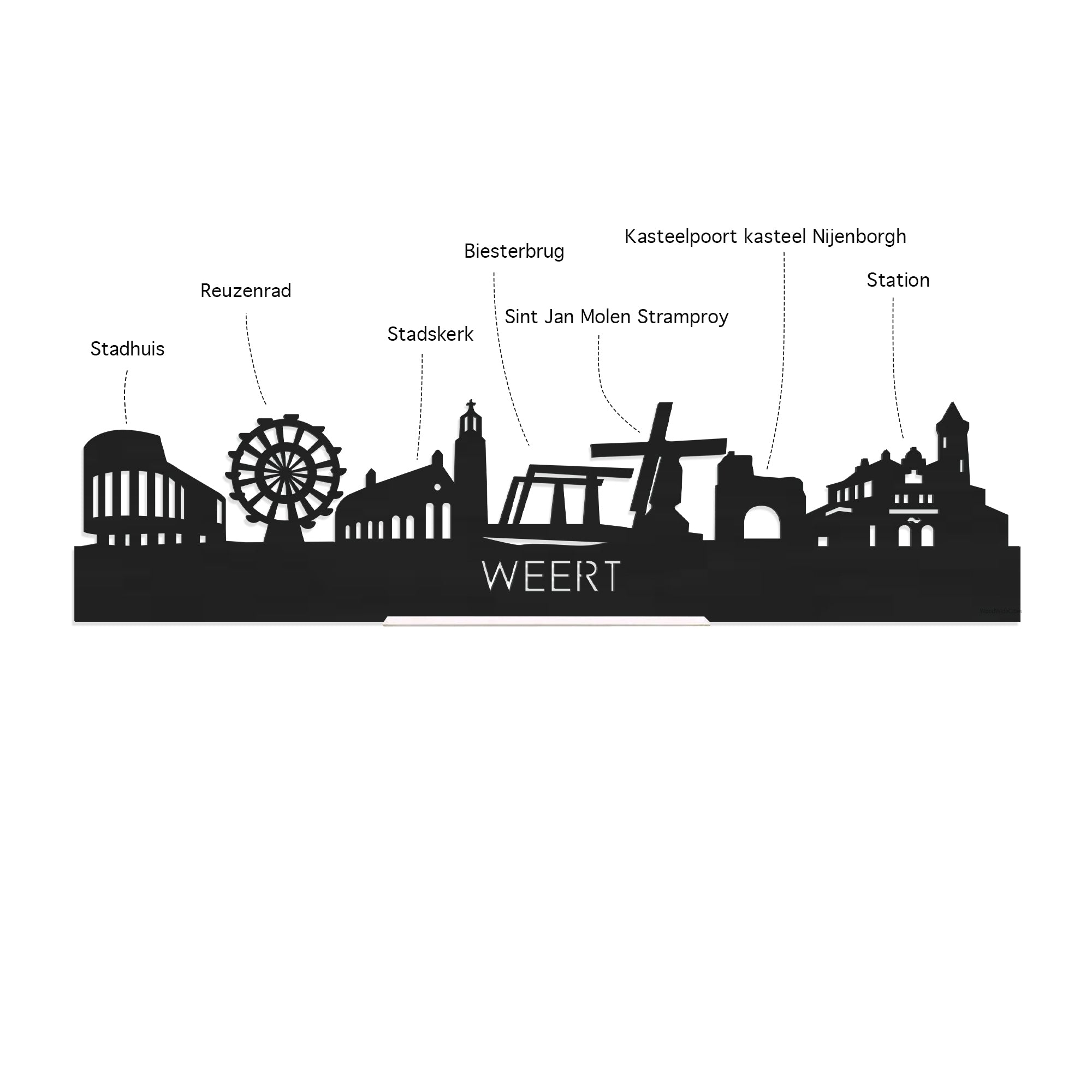 Je herkent ze vast allemaal; de hoogtepunten van deze geliefde plaats: Stadhuis gemeente Weert, Reuzenrad, Stadskerk Weert, Biesterbrug, Sint Jan Molen Stramproy, Kasteelpoort Nijenborgh, Station Weert. De skyline is gemaakt in samenwerking met inwoners uit Weert en het silhouet komt uit het creatieve brein van onze eigen kunstenares. Met liefde gemaakt!