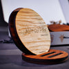 De set bestaat uit 2 eiken en 2 noten houten onderzetters en wordt tevens geleverd met een mooie houder van eikenhout. Deze onderzetters worden niet onder stoelen of banken geschoven. Je kunt gerust pronken met je eigen stukje kunst.