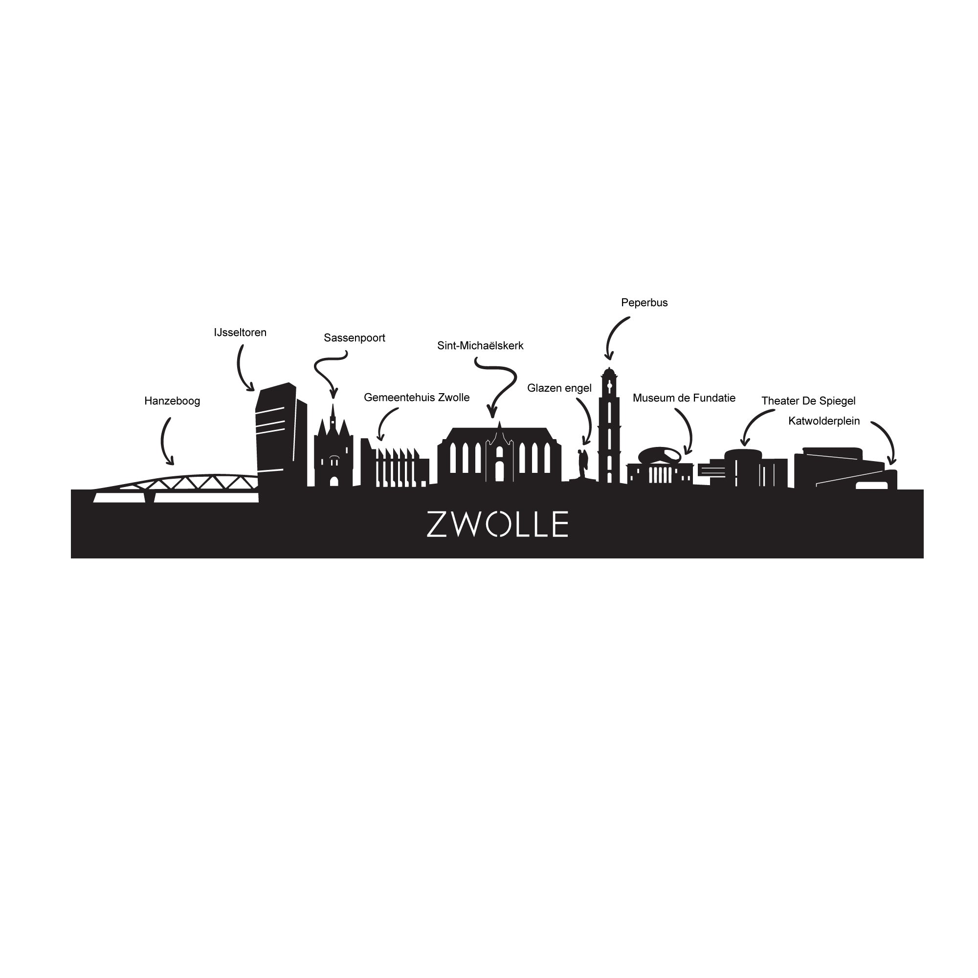 Je herkent ze vast allemaal; de hoogtepunten van deze geliefde plaats: Hanzeboog, IJsseltoren, Sassenpoort, Gemeentehuis Zwolle, Sint-Michaëlskerk, Glazen engel, Peperbus, Museum de Fundatie, Theater de Spiegel, Katwolderplein. De skyline is gemaakt in samenwerking met Zwolle ondernemers en het silhouet komt uit het creatieve brein van een architect, dus alle verhoudingen kloppen.