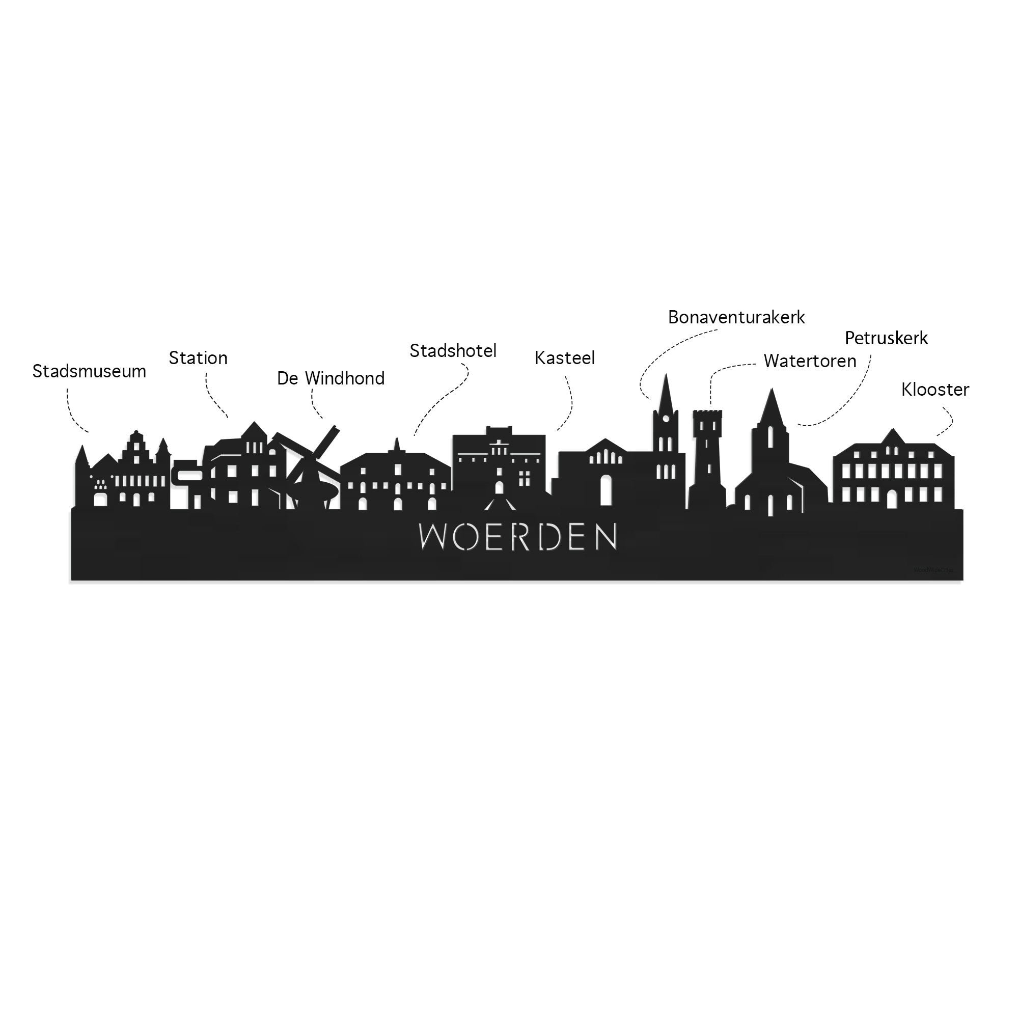 Je herkent ze vast allemaal; de hoogtepunten van deze geliefde plaats: Stadsmuseum Woerden, Station Woerden, De Windhond, Stadshotel Woerden, Kasteel Woerden, Bonaventurakerk, Watertoren Woerden, Petruskerk Woerden en Klooster Woerden. De skyline is gemaakt in samenwerking met Woerden ondernemers en het silhouet komt uit het creatieve brein van een architect, dus alle verhoudingen kloppen.