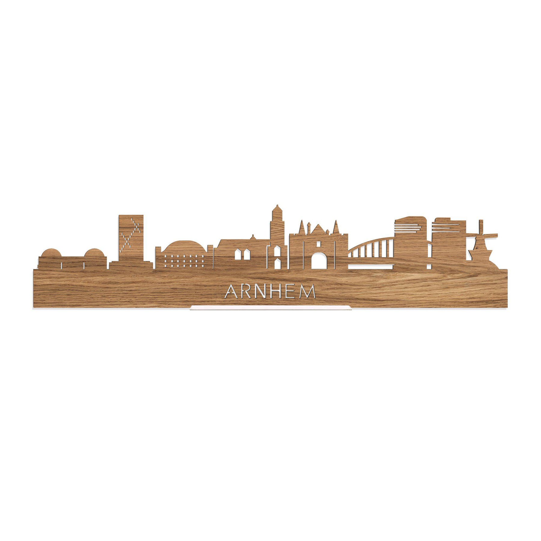 Je herkent ze vast allemaal; de hoogtepunten van deze geliefde plaats: GelreDome, Helix, koepelgevangenis Arnhem, Eusebiuskerk, Sabelspoort, John Frostbrug, Parktoren en Rijntoren en Molen de Kroon. De skyline is gemaakt in samenwerking met Arnhem ondernemers en het silhouet komt uit het creatieve brein van een architect, dus alle verhoudingen kloppen.