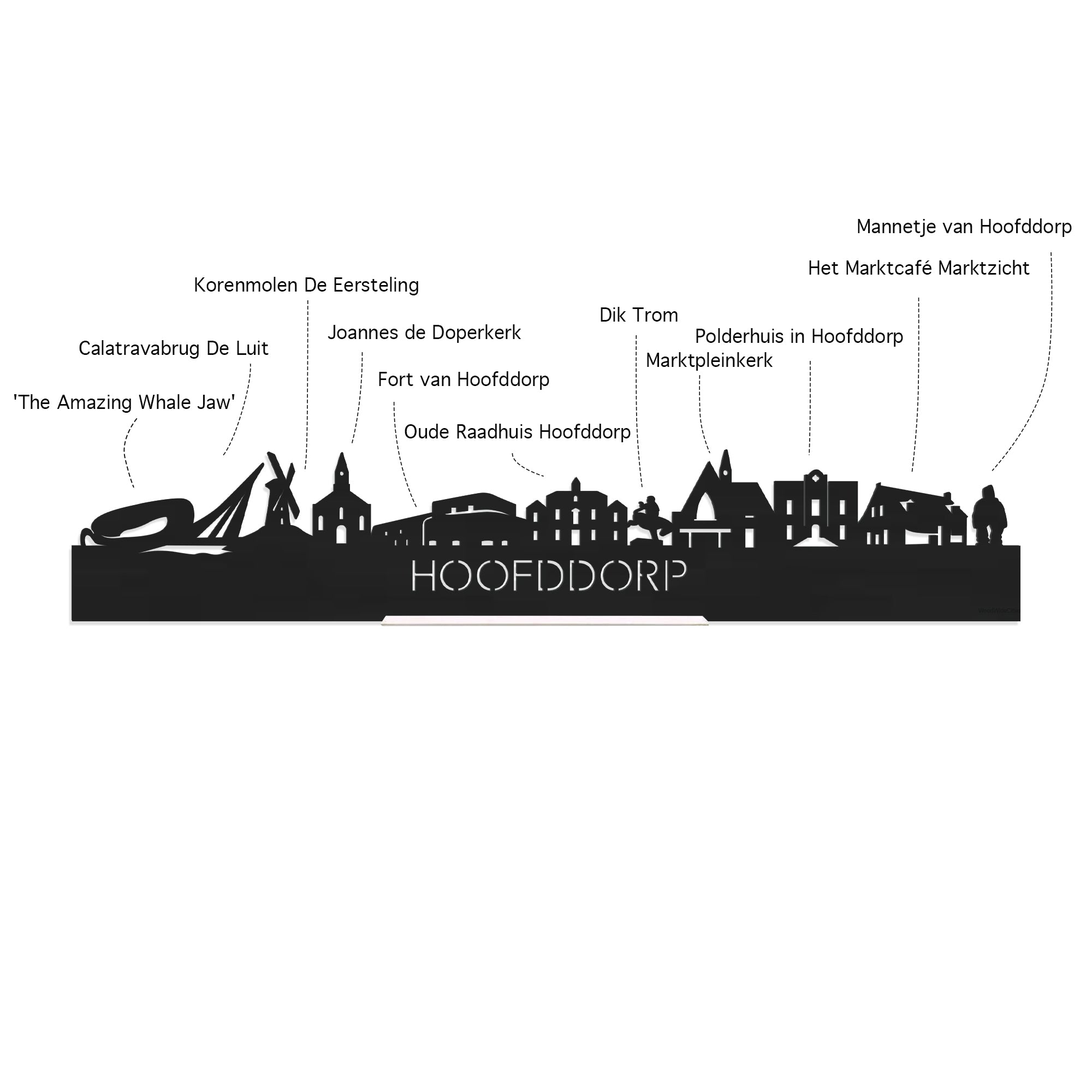 Je herkent ze vast allemaal; de hoogtepunten van deze geliefde plaats: Sculptuur 'The Amazing Whale Jaw', Calatravabrug De Luit, Korenmolen De Eersteling, Fort van Hoofddorp, Joannes de Doperkerk, Oude Raadhuis Hoofddorp, Marktpleinkerk, Polderhuis in Hoofddorp, Het Marktcafé Marktzicht / Proeflokaal De Polderboom, Dik Trom, Mannetje van Hoofddorp. De skyline is gemaakt in samenwerking met inwoners uit Hoofddorp en het silhouet komt uit het creatieve brein van onze eigen kunstenares. Met liefde gemaakt!