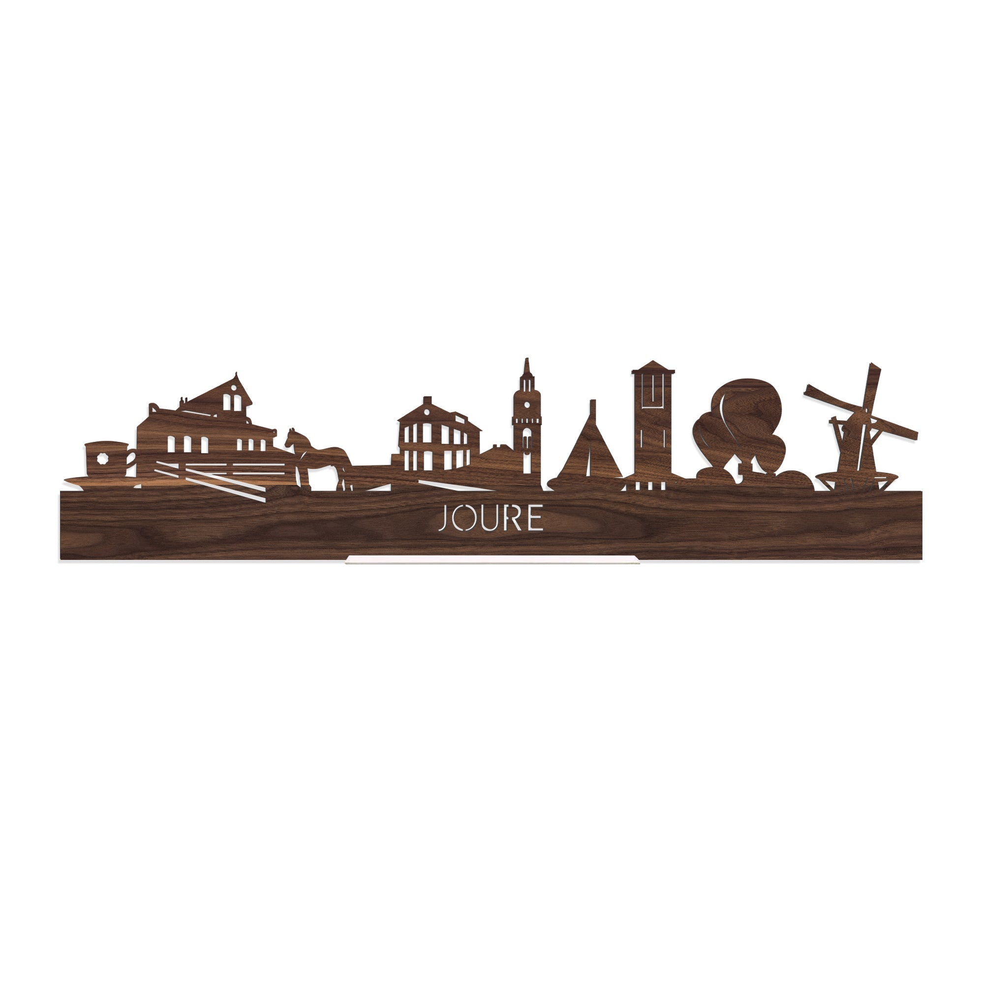 Je herkent ze vast allemaal; de hoogtepunten van deze geliefde plaats: Joustertoer DE Kopje, Metaalfabriek Geelgieterij Keverling, Frische Paard, Hotel Anne-Klare, De Hobbe van Baerdt Tsjerke, Jouster Skutsje, Watertoren Joure, Luchtballonnen, Penninga's Molen. De skyline is gemaakt in samenwerking met Joure ondernemers en het silhouet komt uit het creatieve brein van een architect, dus alle verhoudingen kloppen.