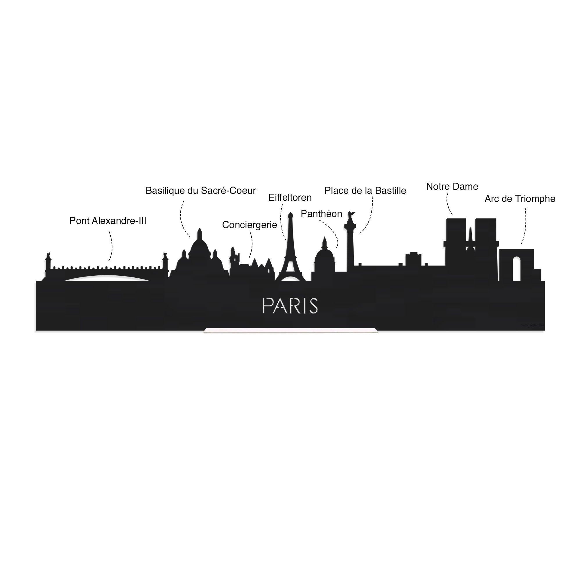 Je herkent ze vast allemaal; de hoogtepunten van deze geliefde plaats: Pont Alexandre-III, Basilique du Sacré-Coeur, Conciergerie, Eiffeltoren, Panthéon, Place de la Bastille, Notre Dame en Arc de Triomphe. De skyline is gemaakt in samenwerking met Parijs ondernemers en het silhouet komt uit het creatieve brein van een architect, dus alle verhoudingen kloppen.