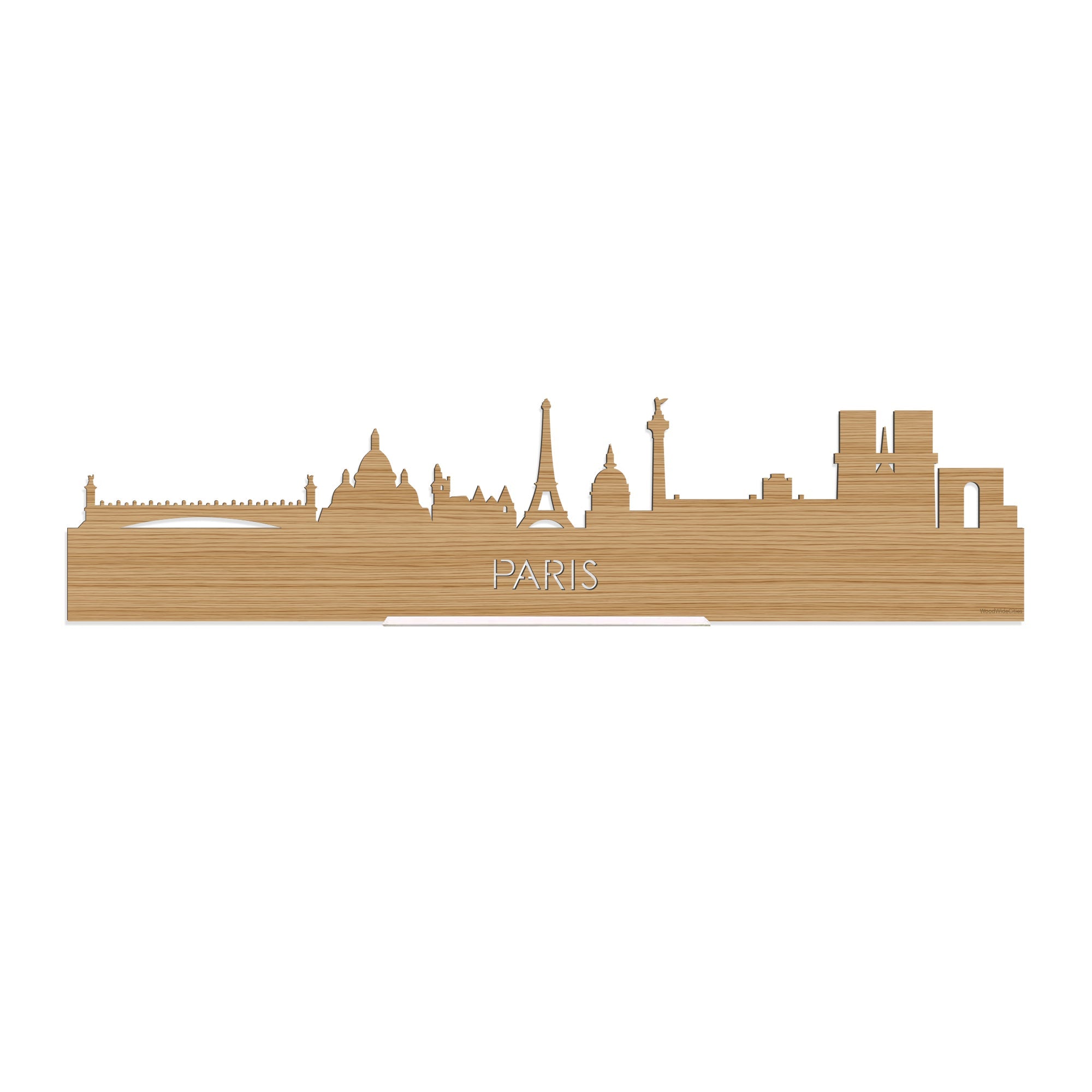 De skyline van Parijs is verkrijgbaar in verschillende soorten hout: zwart MDF, eiken, bamboe, noten en palissander. De houtsoorten zijn duurzaam, ecologisch en gekeurd. Dat vinden wij belangrijk! Bij het produceren van houten decoraties komen geen schadelijke stoffen vrij, hout gaat langer mee en het is biologisch afbreekbaar. Daarnaast is de houten afwerking bij elke skyline anders. Dat maakt jouw skyline uniek!