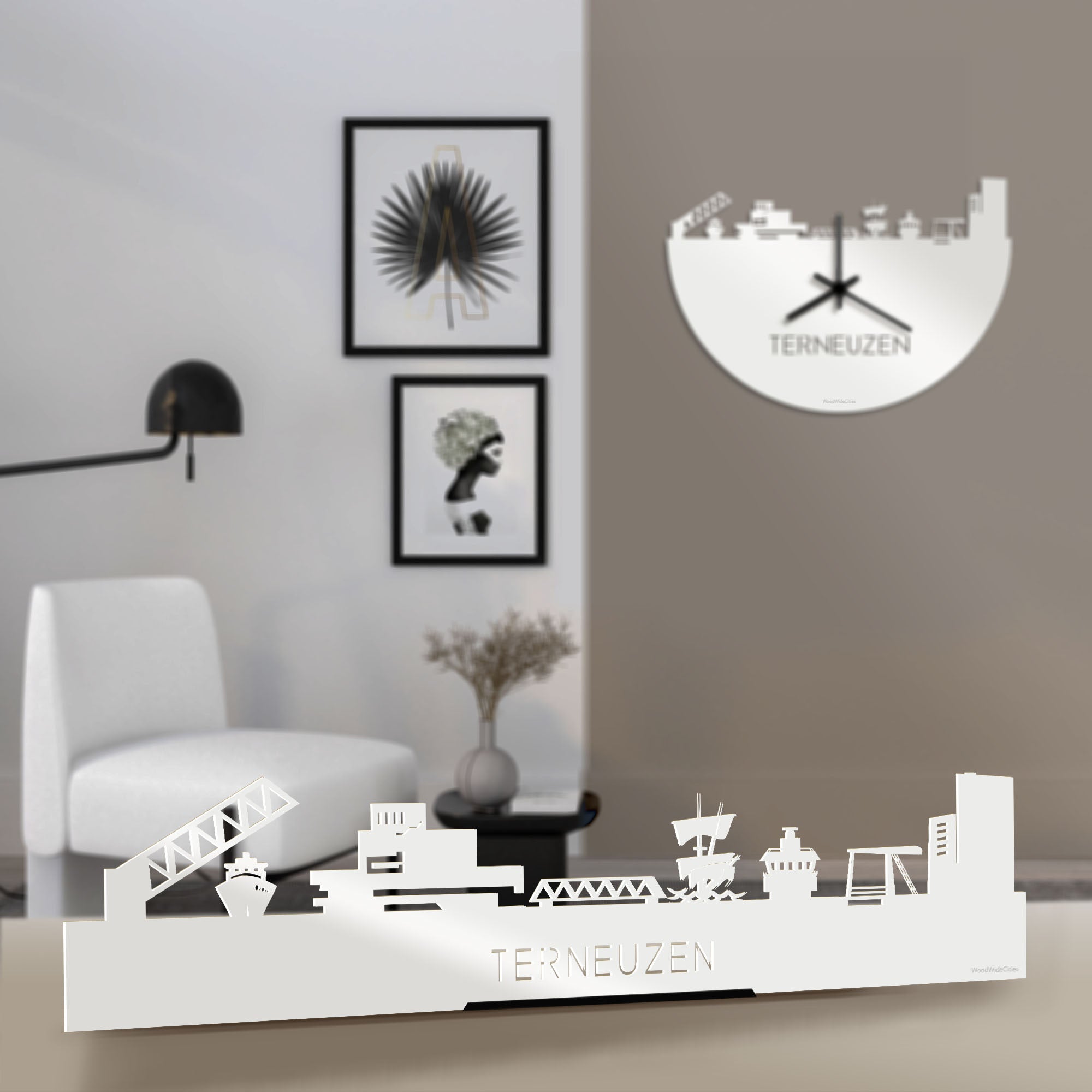 Je herkent ze vast allemaal; de hoogtepunten van deze geliefde plaats: Sluizencomplex Terneuzen, Stadshuis van Terneuzen, Brug Sluiskil, Vliegende Hollander, Radartoren, Brug Terneuzen, Waterfront. De skyline is gemaakt in samenwerking met inwoners uit Terneuzen en het silhouet komt uit het creatieve brein van onze eigen kunstenares. Met liefde gemaakt!